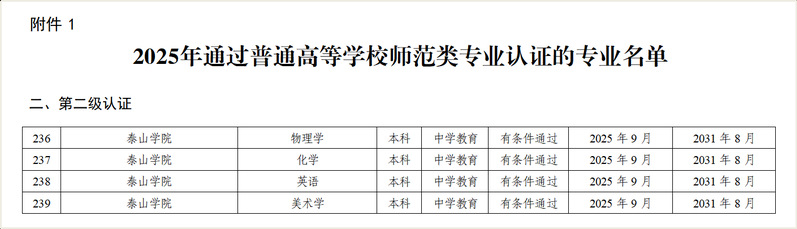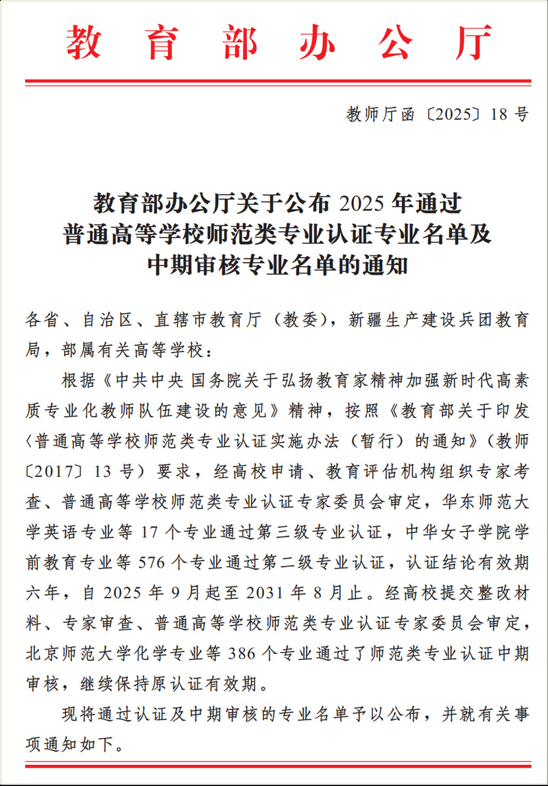 近日,教育部办公厅下发了《关于公布2025年通过普通高等学校师范类专业认证专业名单及中期审核专业名单的通知》(教师厅函〔2025〕18号),我校物理学、化学、英语、美术学四个专业通过认证,通过数量居省内高校前列。