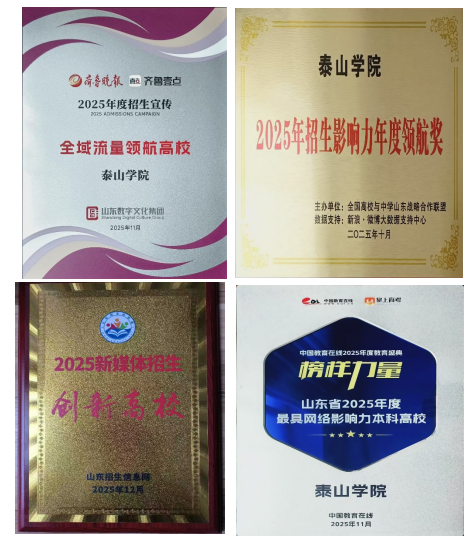 近日,中国教育在线、新浪微博、齐鲁晚报、山东招生信息网等高考宣传媒体纷纷颁布2025年度山东高考宣传成果奖项,学校凭借招生工作的突出成效与广泛社会影响力,先后荣膺“山东省2025年度最具网络影响力本科高校”(中国教育在线)、“2025年度招生宣传全域流量领航高校”(齐鲁晚报·齐鲁壹点)、“2025年招生影响力年度领航奖”(新浪微博)、“2025新媒体招生创新高校”(山东招生信息网)等多项省级荣誉。